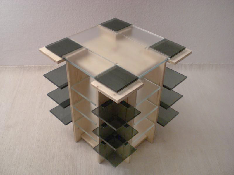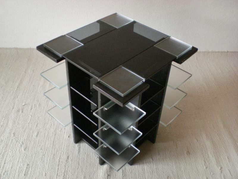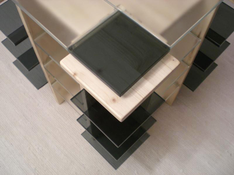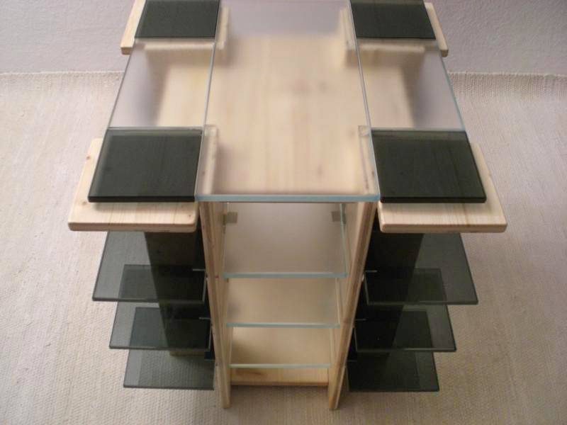 Der Tisch zeichnet sich ebenso durch eine einfache, schnörkellose Symmetrie aus, die sowohl in allen Holzelementen wiederzufinden ist, als auch in den Glasfächern.