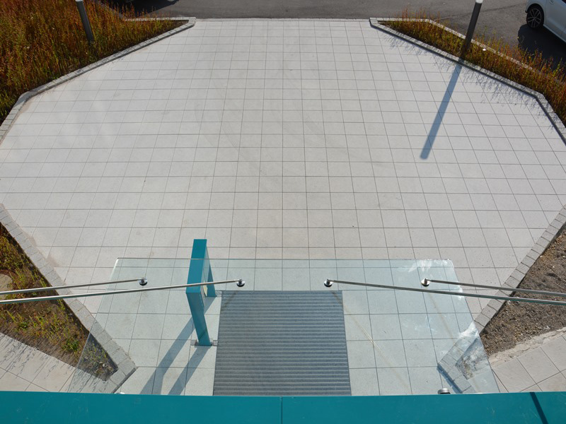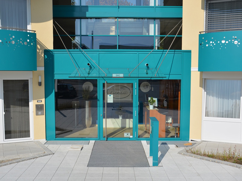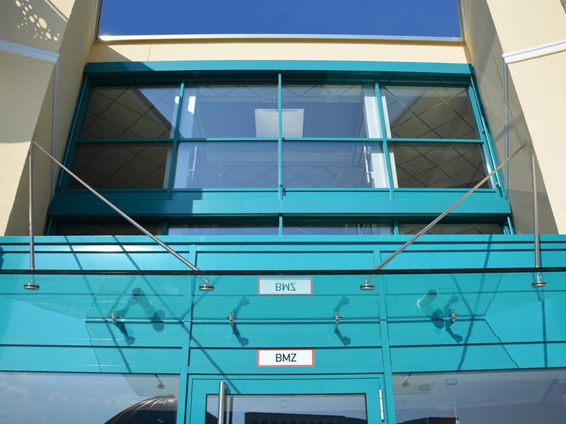 Die Vordachkonstruktion am Haupteingang des Hotel Garni / Therme Erding wurde ganz aus Glas konzipiert, welches in Bezug auf die Größe des Glases (3000 mm / 1700 mm) in dieser Bauform, an der Grenze des Realisierbaren liegt.