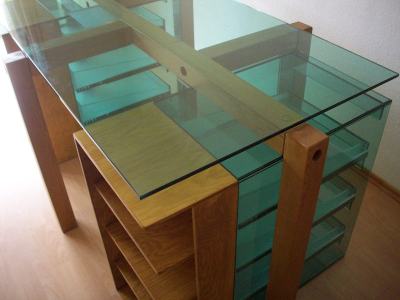 Der Tisch besteht aus zwei Glaskorpussen welche jeweils drei Schubläden enthalten, zwei rückseitig beigestellten Regalen aus Multiplex, der Tragkonstruktion aus Vollholz sowie der Deckscheibe aus Einscheibensicherheitsglas (ESG).