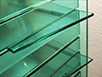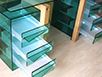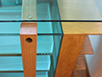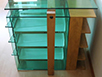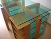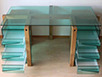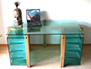 Dieser Glasschreibtisch ist in einer Kombination der Gläser "Parsol grün" und "Weissglas mattiert", in Verbindung mit behandeltem Fichtenholz ausgeführt.