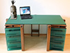 Dieser Schreibtisch neigt sich dezent, wie ein Cockpit, um den Sitzplatz des "Schreibers", was die Bedienung der jeweils drei Schubläden zu einem Vergnügen macht.