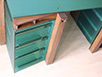 Die Tragstruktur des Schreibtisches besteht aus Vollholz, Beistellregale und Flanken wurden aus Multiplex/Furnierplatte gefertigt. Die hintere Stütze bildet eine Abstellmöglichkeit, so dass die Beine beim arbeiten hochgelegt werden können.