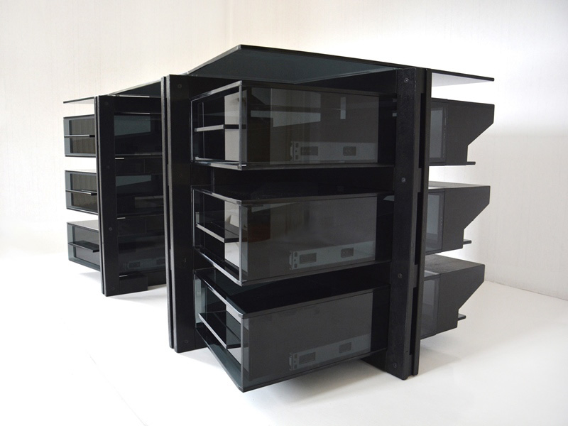 Beidseitig drei Glaskorpusse enthalten jeweils eine kugellagergeführte Glasschublade mit Selbsteinzugsfunktion.