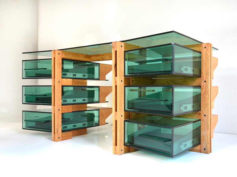 Beidseitig drei Glaskorpusse enthalten jeweils eine kugellagergeführte Glasschublade mit Selbsteinzugsfunktion.