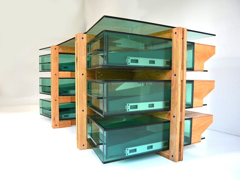 Die einzelnen Glaskorpusse werden von einer Holzkonstruktion in Skelettbauweise in ihrer Mitte umklammert, lassen sie jedoch ansonsten frei in der Luft schweben.