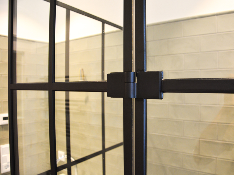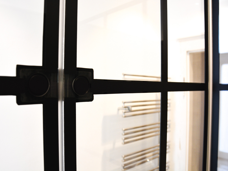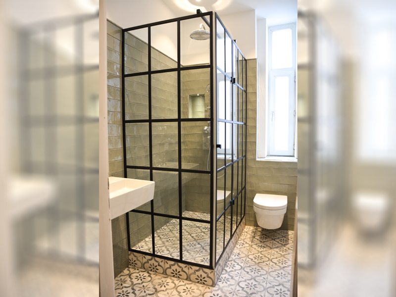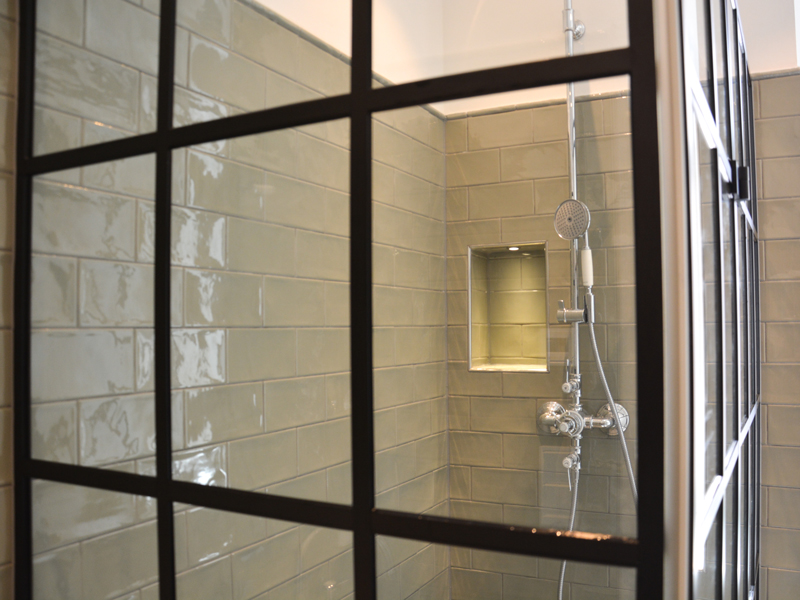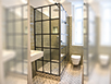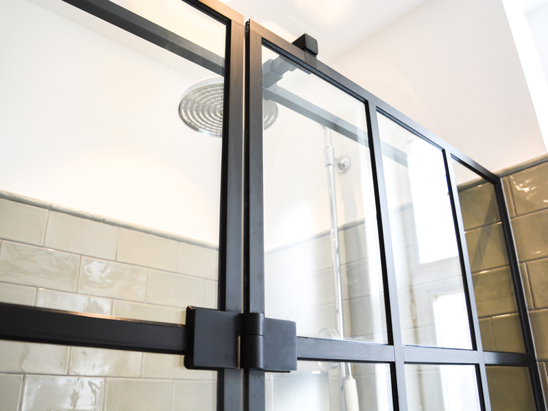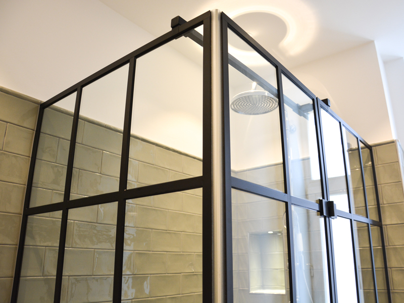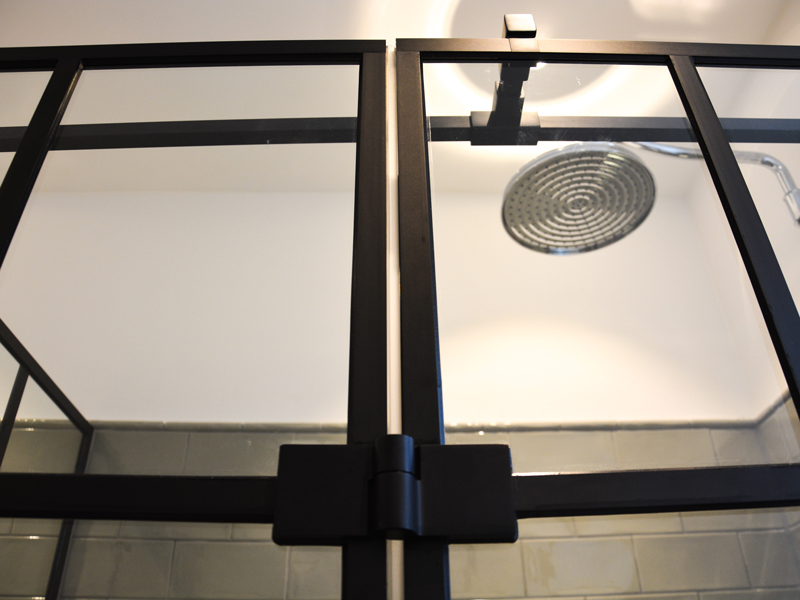 Eine gelungene Kombination der Optik traditioneller Industrieverglasungen und modernen, funktionellen Komponenten gemäß dem aktuellen Stand der Technik, vereint diese Glasdusche.