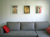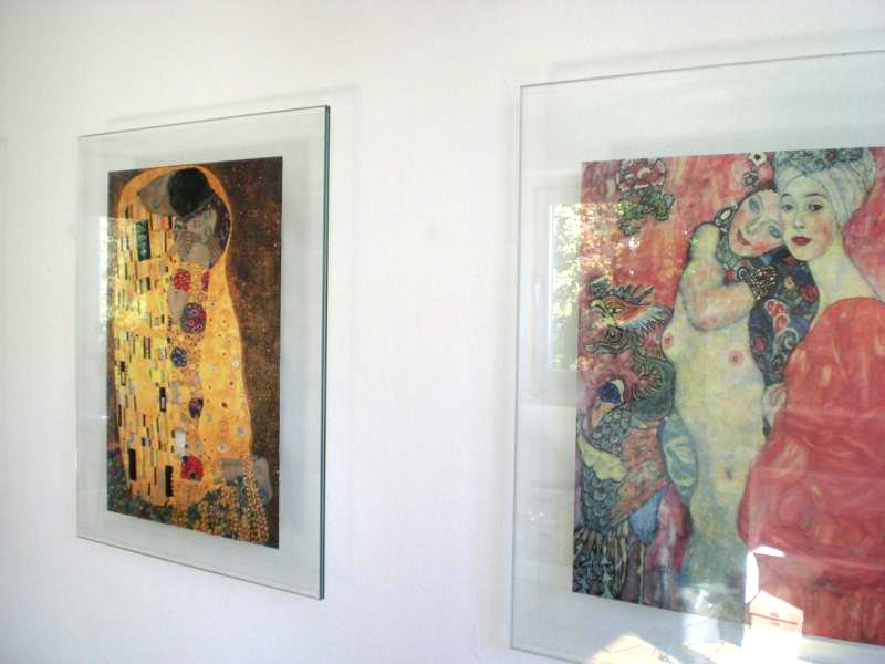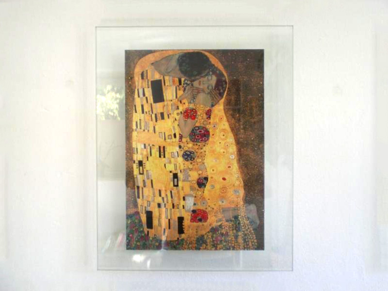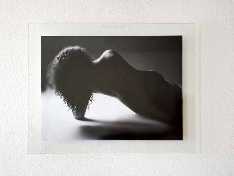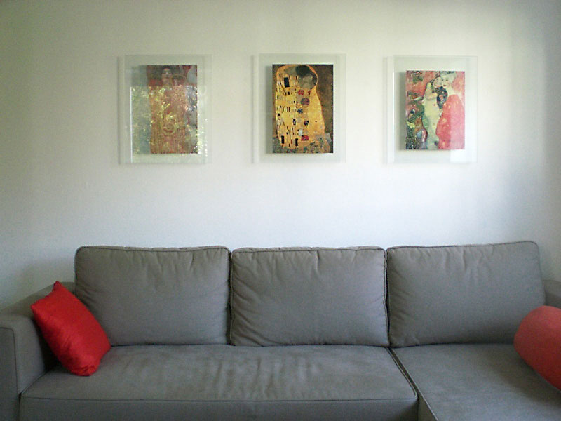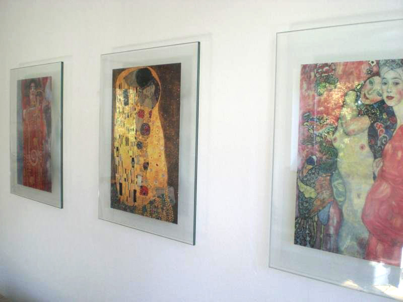 Die Glasscheiben in die die Bilder eingefasst sind, wurden mit einem von vorn nicht sichtbaren Haltesystem an der Wand installiert, die Bilder können somit frei von störenden Befestigungen ins Zentrum des Blickes treten.