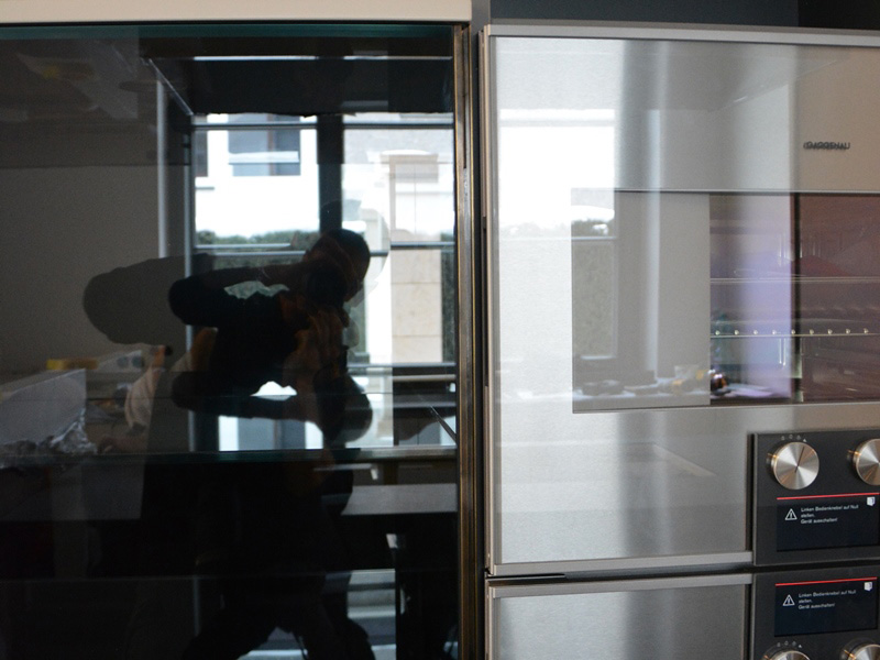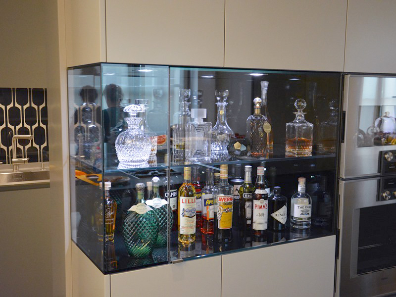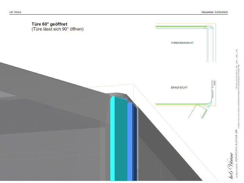 Ausgeführt in Weissglas, welches in Kombination mit grauem Farbglas 3-dimensional umlaufend auf Gehrung verklebt und zum Teil verspiegelt wurde, vereint diese Vitrine hochwertigste Grundkomponenten mit ausgereifter handwerklicher Technik.