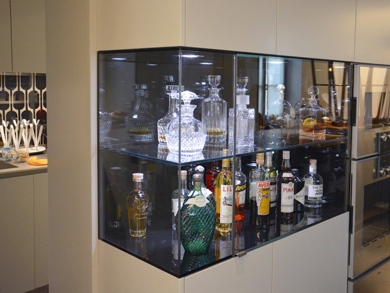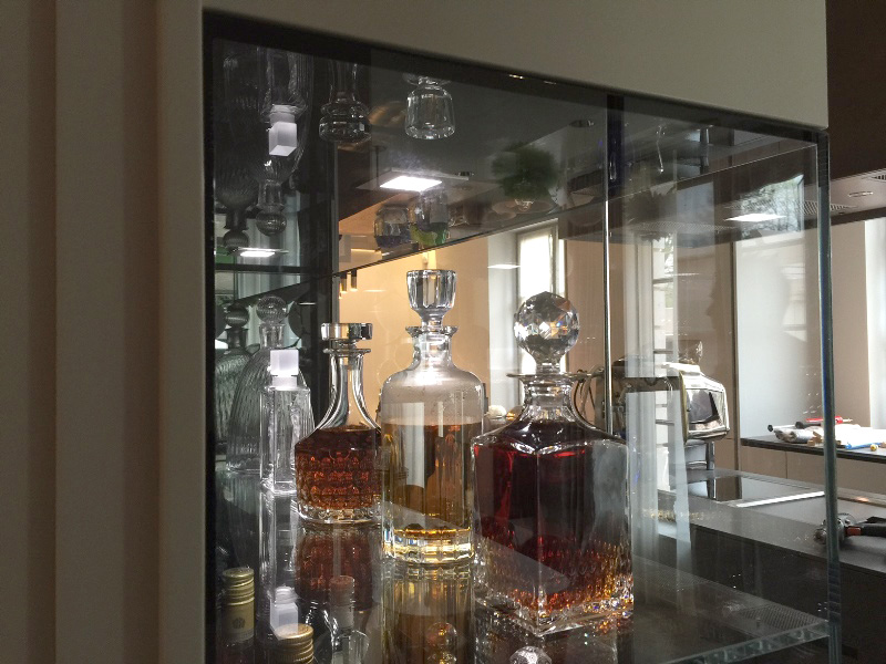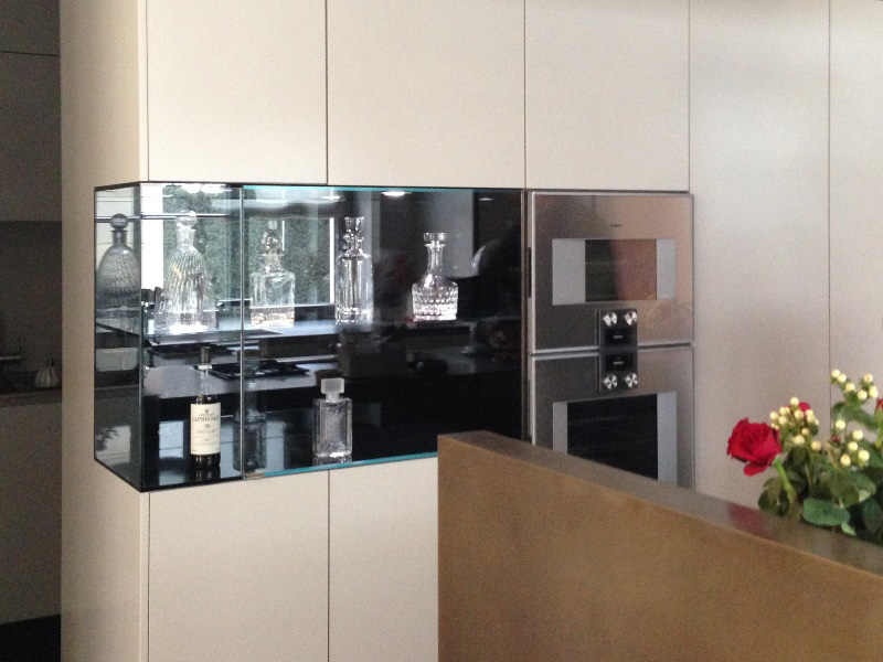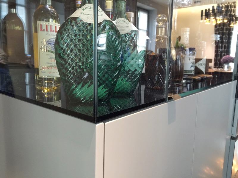 Diese für den Kunden exklusiv geplante und gefertigte Spezialvitrine wurde sehr detailliert an das Interieur angepasst.