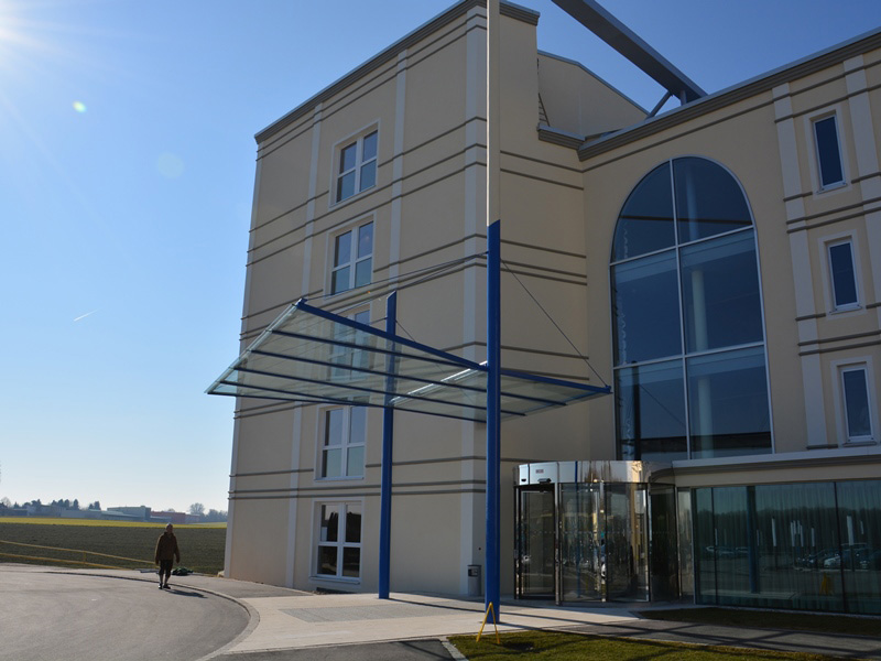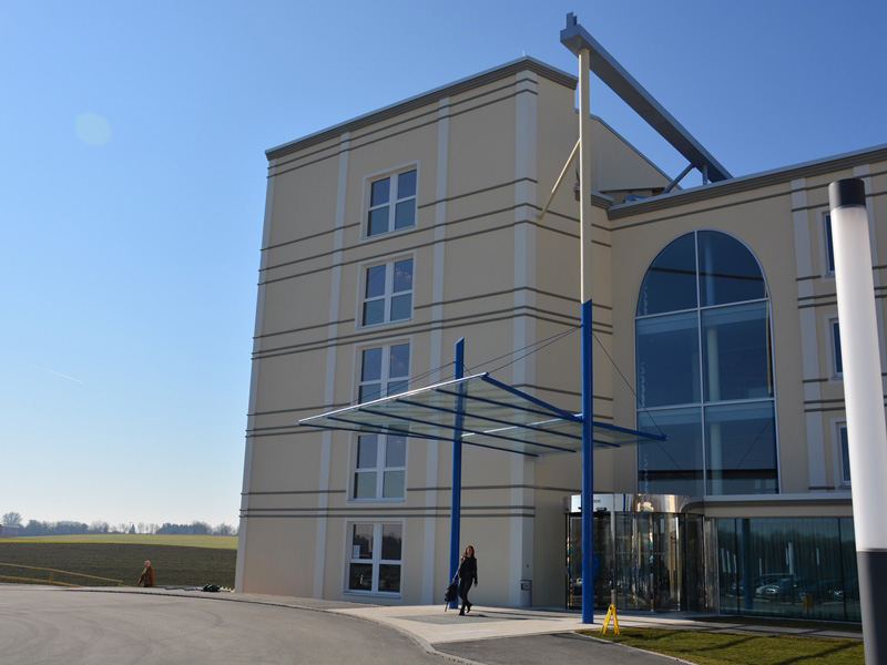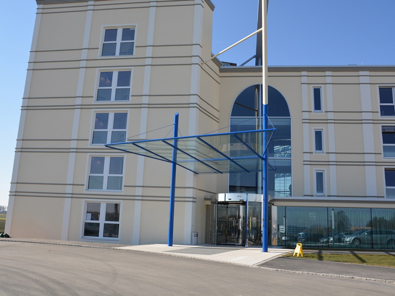 Die an den Pylon des fahrbaren Hauptdaches der Therme Erding / Hotel Victory angegliederte Vordachkonstruktion wurde in maximal filigraner Bauweise konzipiert.