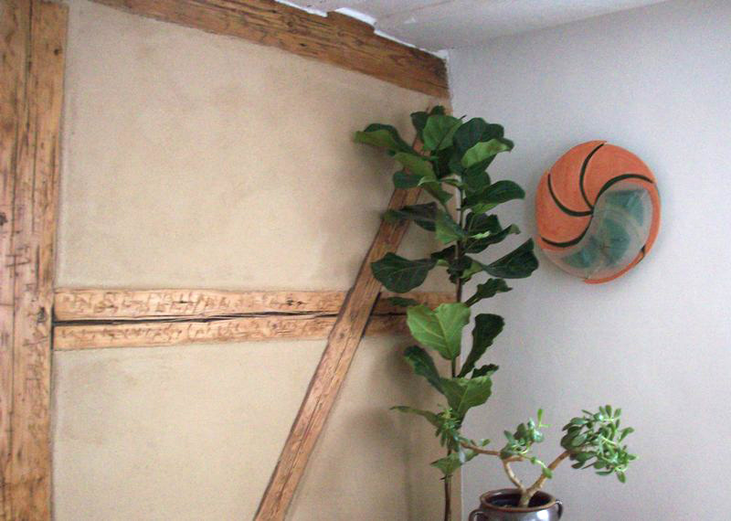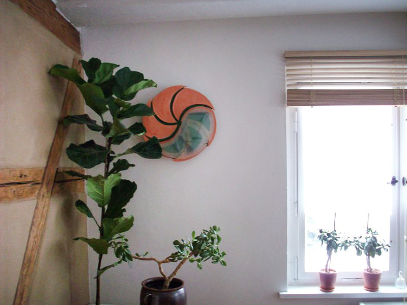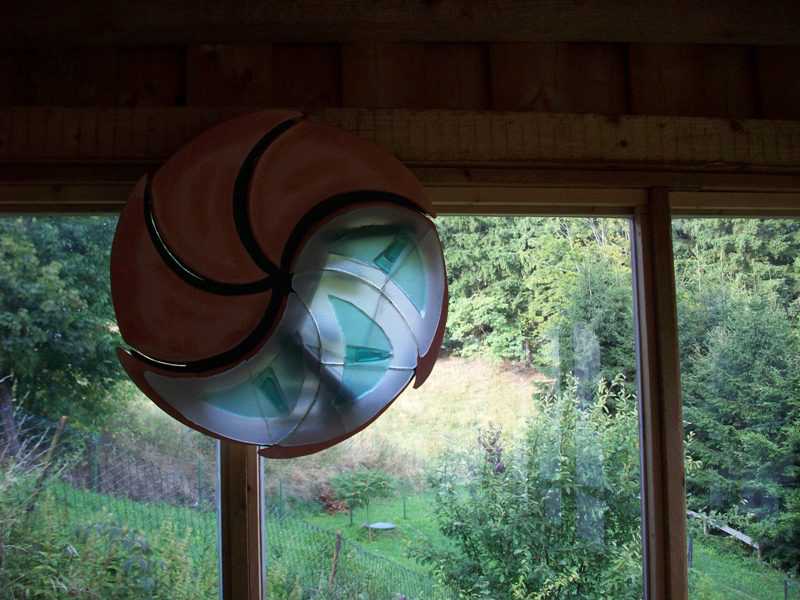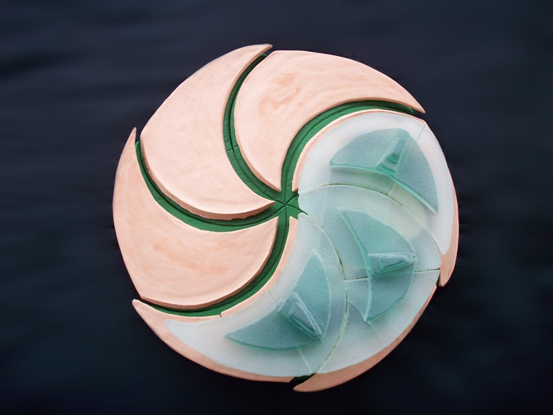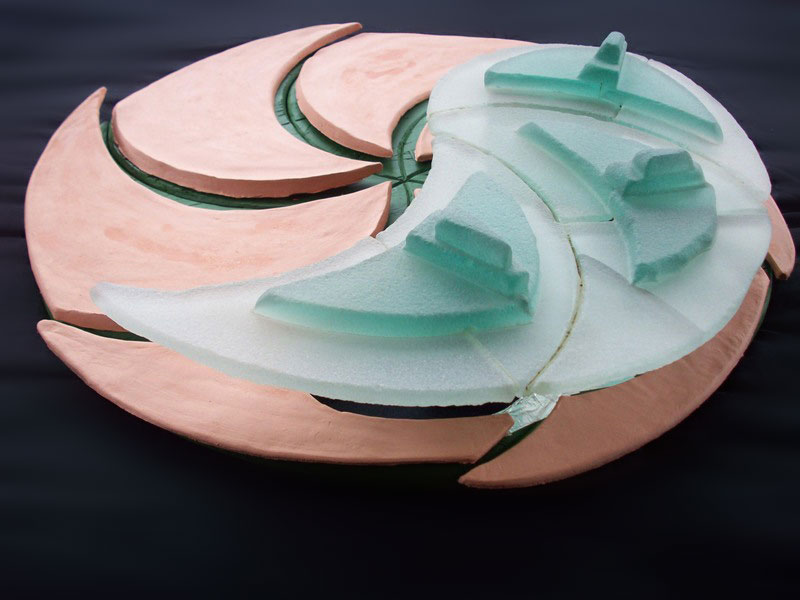 Die an dem Stil des asiatischen Yin-Yan Symbols orientierte Wandlampe wurde in einer Kombination von mattierten Glas (sandgestrahlt) und speziell geformten Terrakotta - Platten ausgeführt.