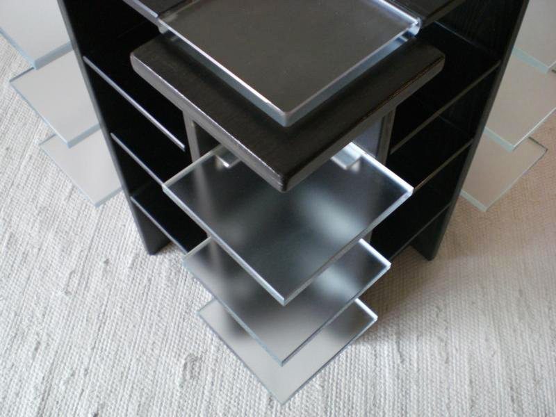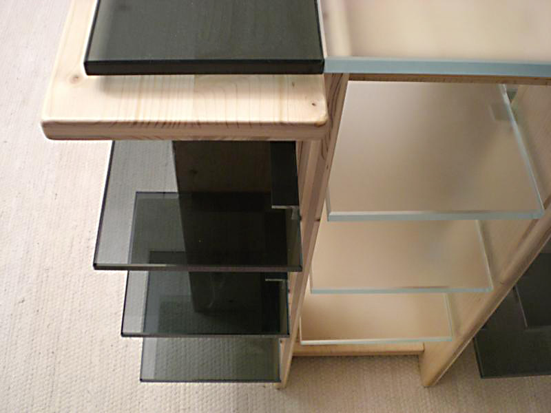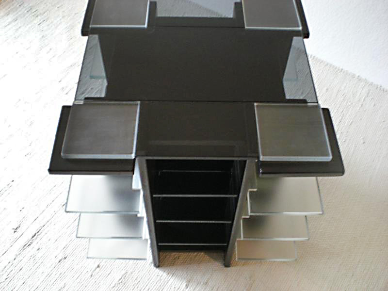 Der Tisch zeichnet sich ebenso durch eine einfache, schnörkellose Symmetrie aus, die sowohl in allen Holzelementen wiederzufinden ist, als auch in den Glasfächern.