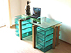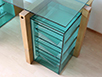Dieser Glasschreibtisch ist in einer Kombination der Gläser "Parsol grün" und "Weissglas mattiert", in Verbindung mit behandeltem Fichtenholz ausgeführt.