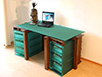 Die Tragstruktur des Schreibtisches besteht aus Vollholz, Beistellregale und Flanken wurden aus Multiplex/Furnierplatte gefertigt. Die hintere Stütze bildet eine Abstellmöglichkeit, so dass die Beine beim arbeiten hochgelegt werden können.