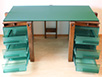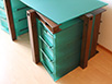 Dieser Schreibtisch neigt sich dezent, wie ein Cockpit, um den Sitzplatz des "Schreibers", was die Bedienung der jeweils drei Schubläden zu einem Vergnügen macht.