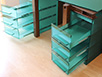 Die Schubläden verfügen über kugelgelagerte Führungen mit Selbsteinzug und können bei Bedarf einfach aus dem Glaskorpus ausgehängt werden. Zwischen beiden Korpussen ist ausreichend Platz vorhanden um zum Beispiel einen PC Tower oder ähnliches unterzubringen.