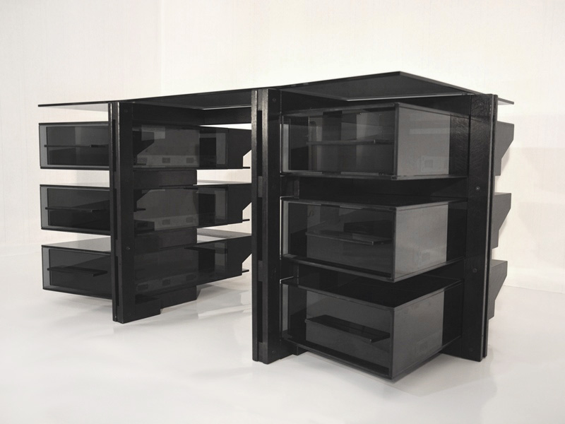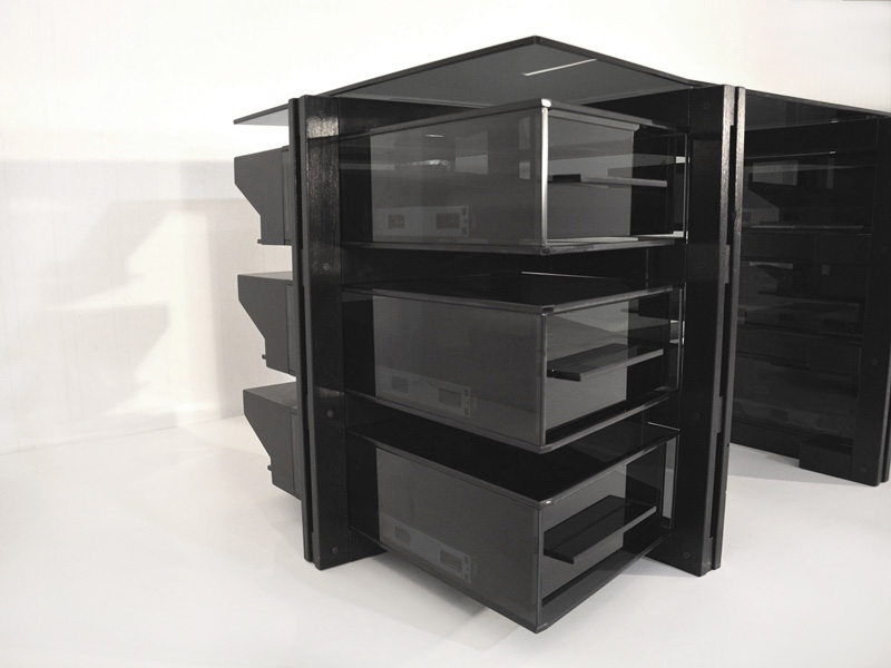 Beidseitig drei Glaskorpusse enthalten jeweils eine kugellagergeführte Glasschublade mit Selbsteinzugsfunktion.