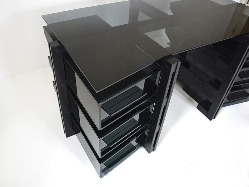 Hochwertigste Grundkomponenten wie 10 mm dickes Farbglas, teilweise satiniert, im Fall der Deckplatte zu Einscheibensicherheitsglas (ESG) vorgespannt, kombiniert mit Edelholz, verbinden hier ansprechende Optik mit Funktionalität und Langlebigkeit.