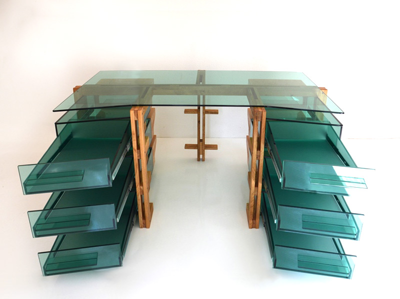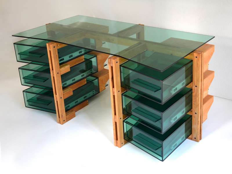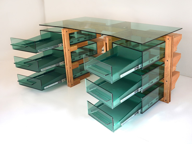 Hochwertigste Grundkomponenten wie 10 mm dickes Farbglas, teilweise satiniert, im Fall der Deckplatte zu Einscheibensicherheitsglas (ESG) vorgespannt, kombiniert mit Edelholz, verbinden hier ansprechende Optik mit Funktionalität und Langlebigkeit.
