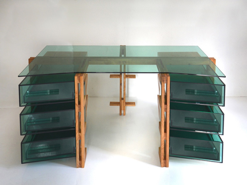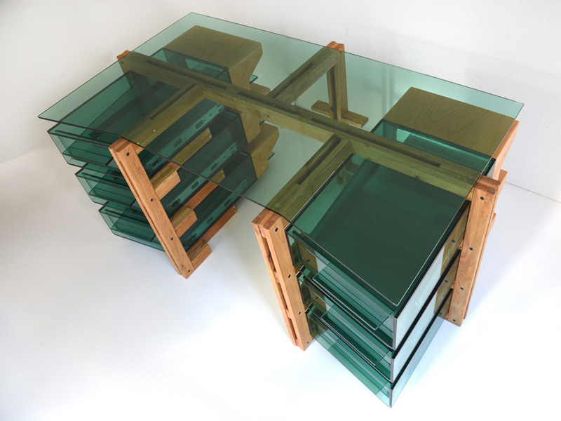 Der Schreibtisch neigt sich dezent, wie ein Cockpit, um den Sitzplatz des "Schreibers".
