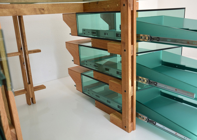 Die einzelnen Glaskorpusse werden von einer Holzkonstruktion in Skelettbauweise in ihrer Mitte umklammert, lassen sie jedoch ansonsten frei in der Luft schweben.