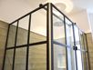 Eine gelungene Kombination der Optik traditioneller Industrieverglasungen und modernen, funktionellen Komponenten gemäß dem aktuellen Stand der Technik, vereint diese Glasdusche.