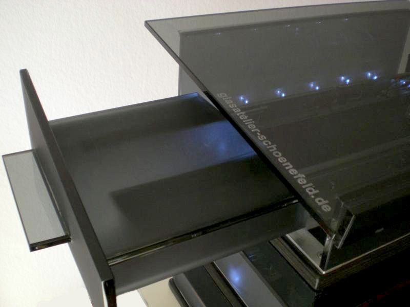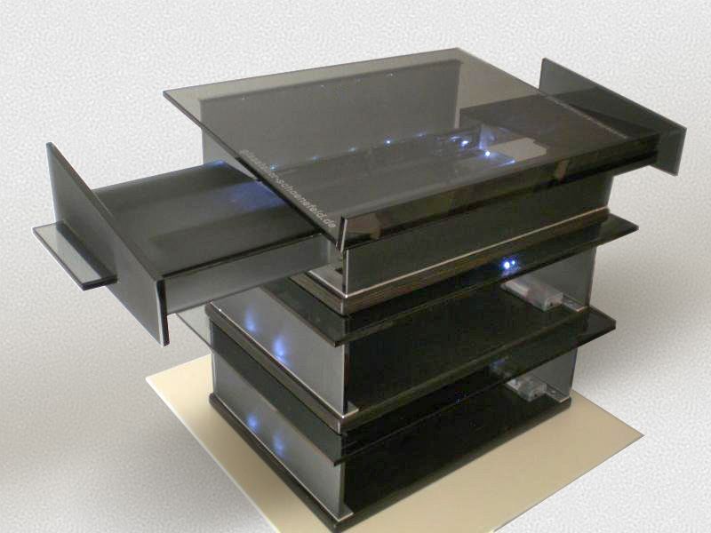 Im oberen Element beidseitig vorhandene Schubladen ermöglichen die Handhabung einer Maus in Verbindung mit einem Notebook, die unteren Elemente bieten Platz für Unterlagen, Notizen, Dokumente, Handy, IPhone, usw.