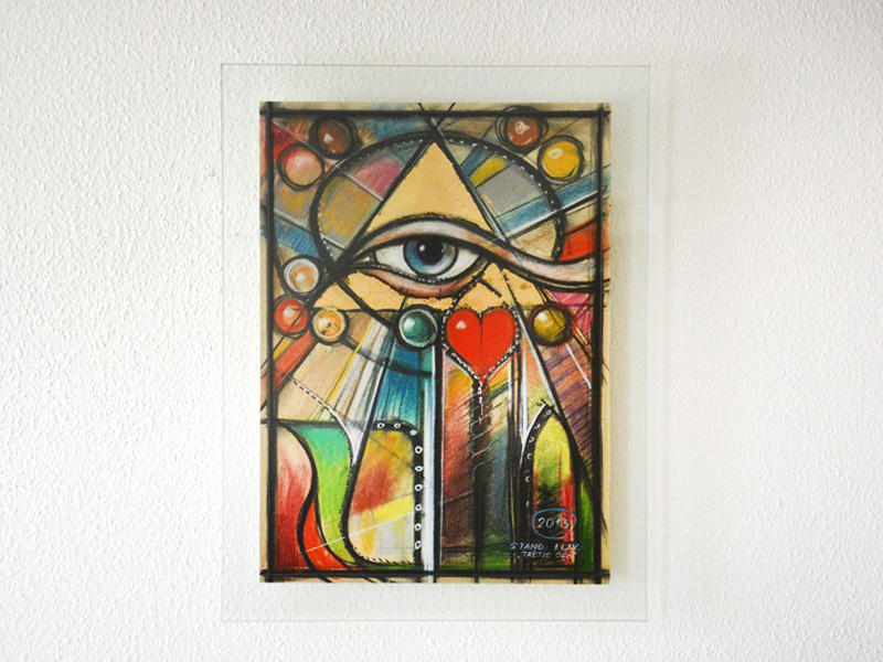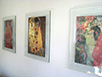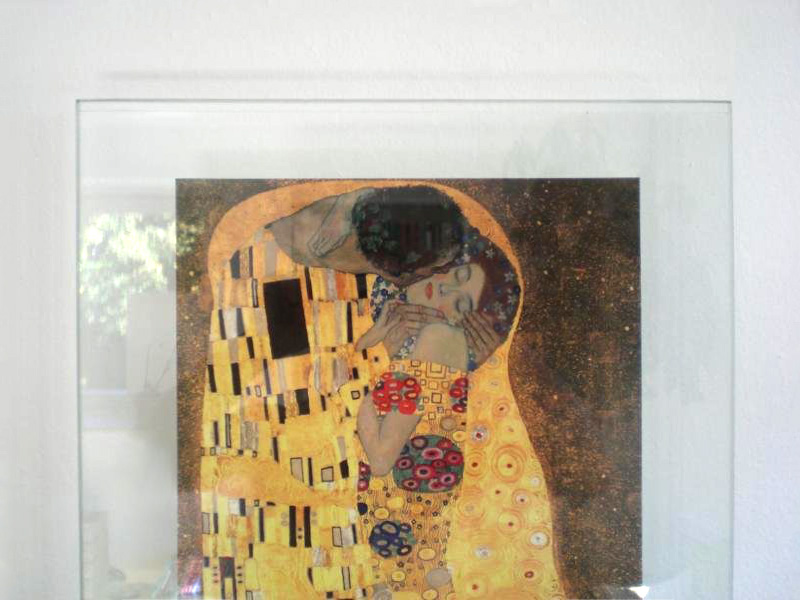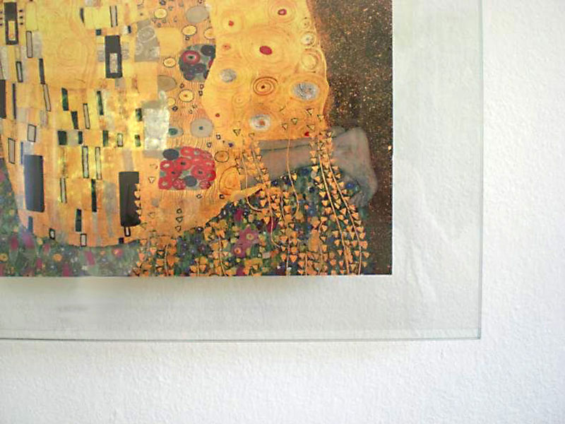 Die Glasscheiben in die die Bilder eingefasst sind, wurden mit einem von vorn nicht sichtbaren Haltesystem an der Wand installiert, die Bilder können somit frei von störenden Befestigungen ins Zentrum des Blickes treten.