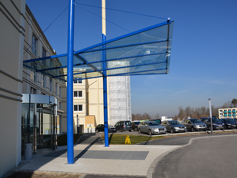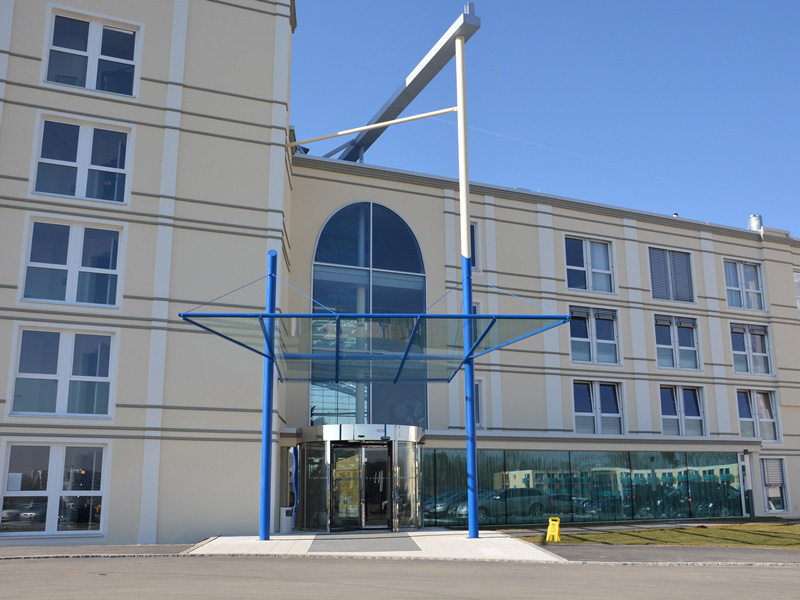 Die an den Pylon des fahrbaren Hauptdaches der Therme Erding / Hotel Victory angegliederte Vordachkonstruktion wurde in maximal filigraner Bauweise konzipiert.