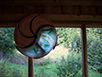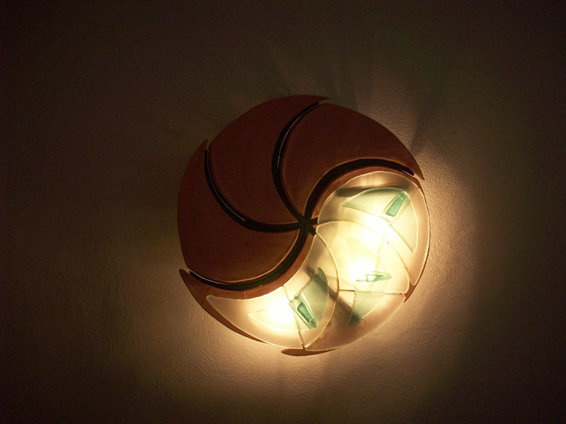 Die an dem Stil des asiatischen Yin-Yan Symbols orientierte Wandlampe wurde in einer Kombination von mattierten Glas (sandgestrahlt) und speziell geformten Terrakotta - Platten ausgeführt.